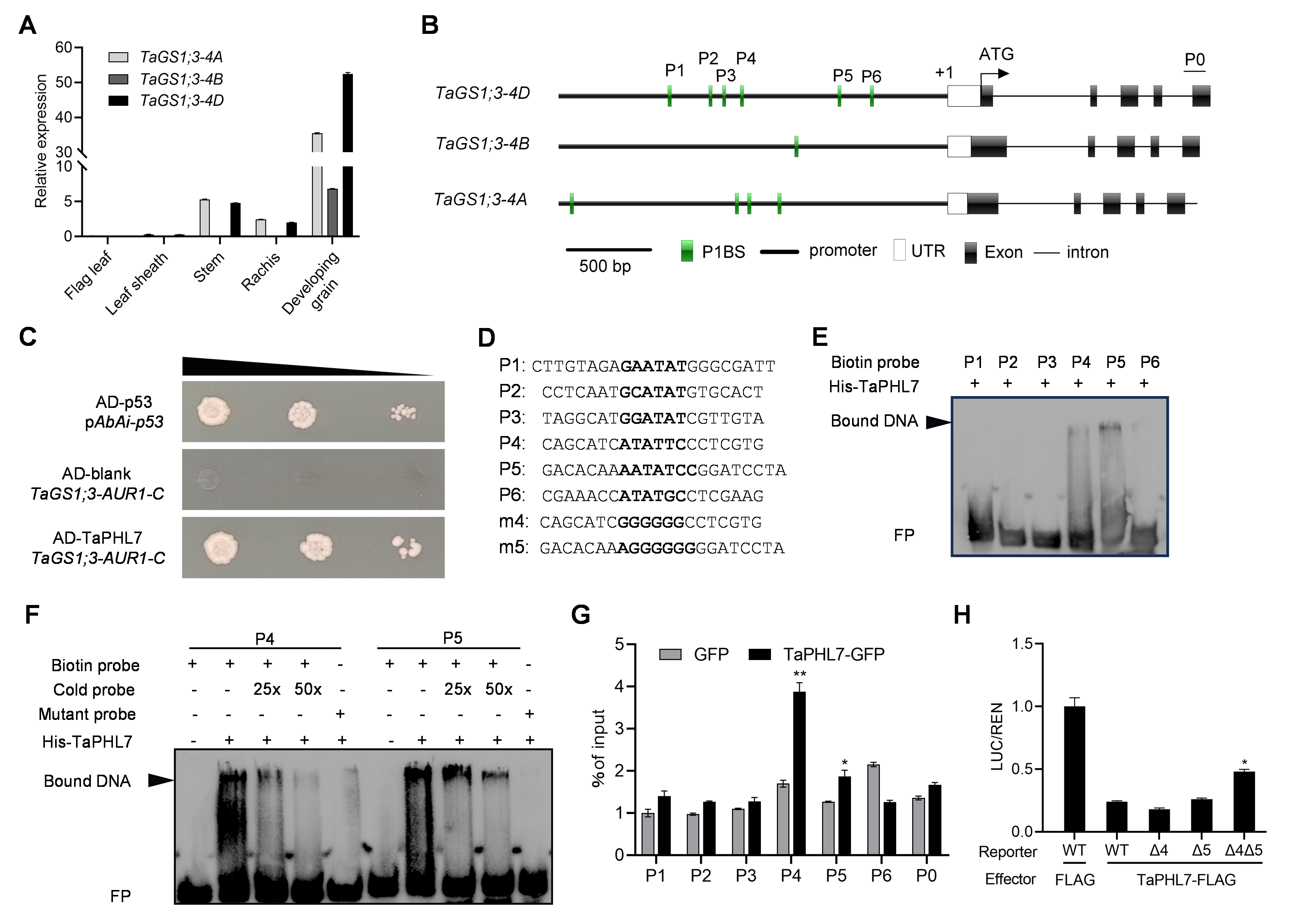 TaGS1;3-4D 启动子的表达。表明 TaPHL7 通过识别 P1BS 基序结合
