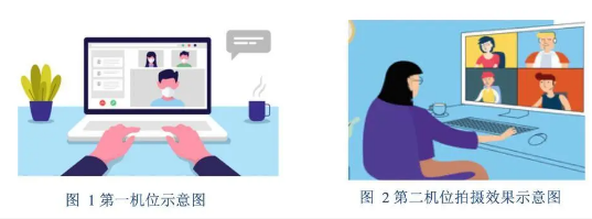 2. 一台设备(第一机位)(使用手机时请横屏放置),放置在距离本人30cm处。另一台设备(第二机位)从考生侧后方45°距离本人30cm处拍摄,确保第一机位和第二机位分别从考生面前和身后完整拍摄到考生全身、复试组教师能够从第二机位清晰看到第一机位屏幕。效果图如下: